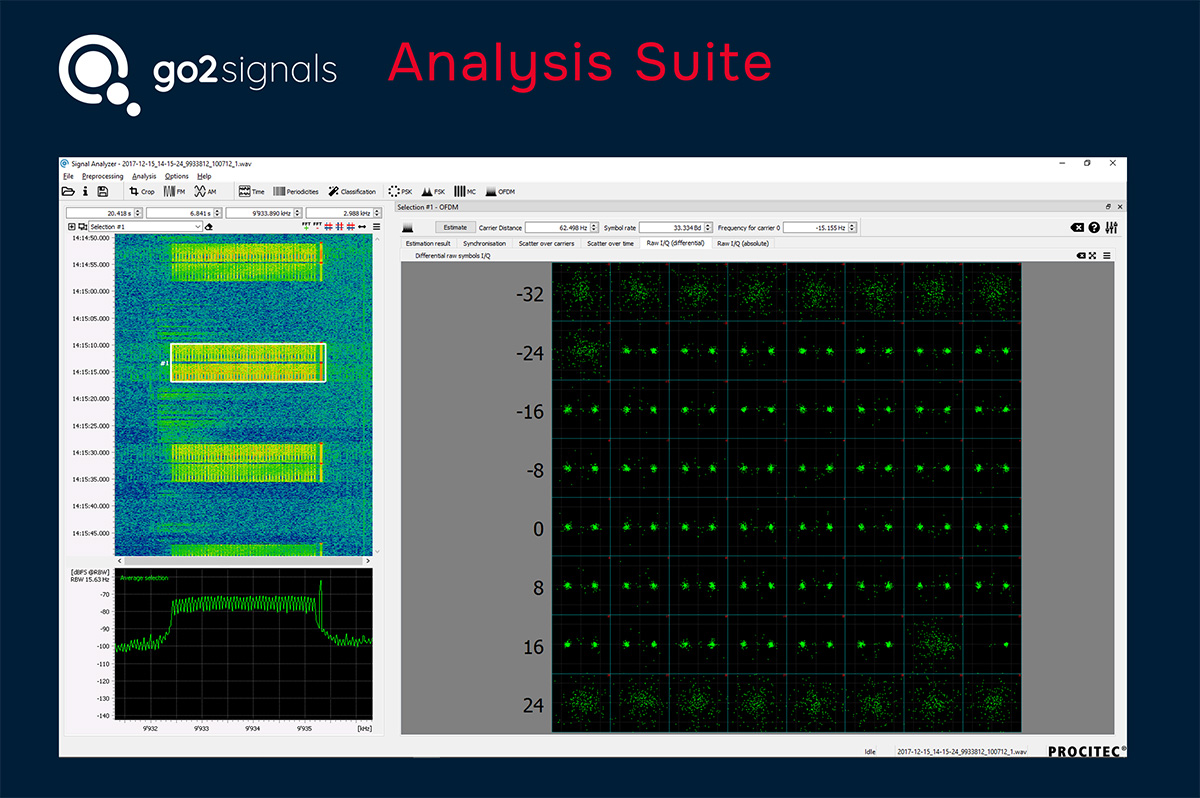 Toolbox for advanced technical and forensic analysis of unknown signals with automated workflows and ready-to-use templates for FSK, PSK, OFDM and more, decoder development and signal simulation.